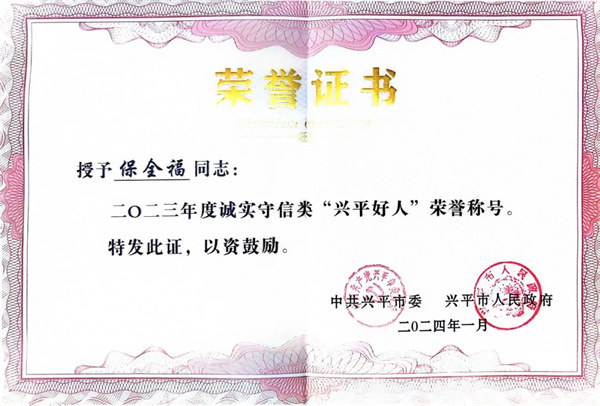 2024年1月被興平市人民政府評(píng)為“興平好人”稱(chēng)號(hào);
