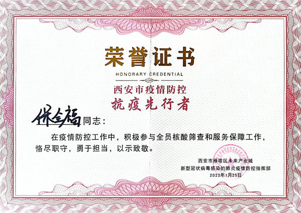 2022年1月獲得“西安市疫情防控抗疫先行者”;